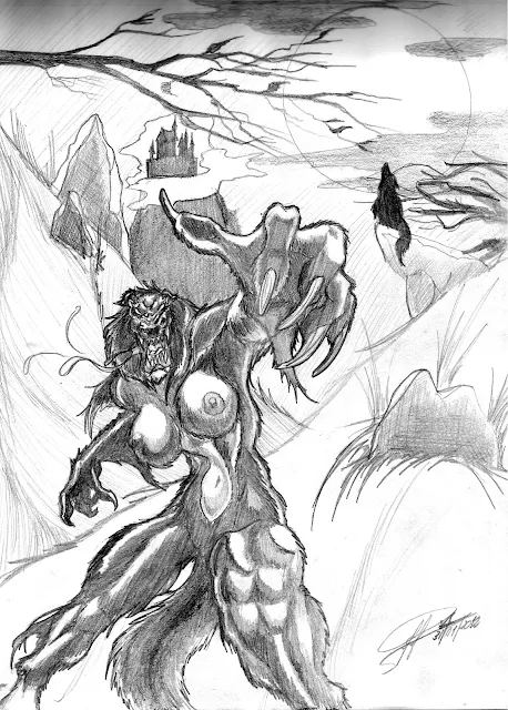 No sabia bien que dibujar, pero siempre me gustaron los licántropos. Yo mismo soy uno. (veníos a vivir conmigo una temporadita y sabréis a que me refiero). Representan, para mi, toda la furia que me trago para no dañar a otros. Son una antítesis de mi mismo, poseen la liberación que tanto ansío y que no me permito sabedor de lo destructivo de su carácter. Pero; para la ocasión me dije "JP. estoy harto de lobos muy machos, hagamos lobas crueles" y este es el resultado. La verdad me lo pasé muy bien, de paso me reconcilie conmigo mismo. Solo es un ejercicio a lápiz, aunque la posturita de la bicheja se las trajo en lata. Ya está esa es la historia, por esta vez paso de lo de empatizar con el personaje, repito que solo es un ejercicio, es todo.